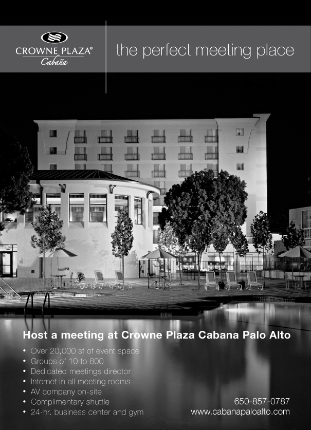 A quarter-page, black and white ad for the Crowne Plaza Cabana Palo Alto hotel targeting meeting planners.
